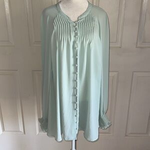 Torrid mint green georgette button front long sleeve blouse. Smocked sleeve openings. Size 4 = US 26. 27 1/2” armpit to armpit laid flat. 31 1/2” front seam to hem. Very good pre owned condition