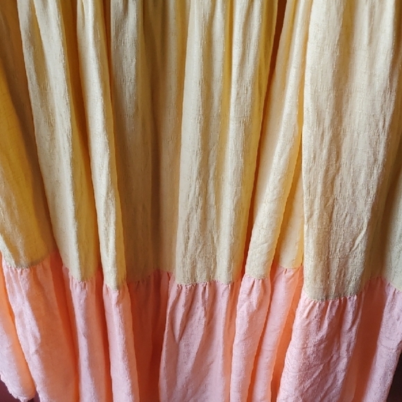 Vibrant maxi skirt with tiered design. Features mint, yellow, and peach colors. Perfect for casual wear.