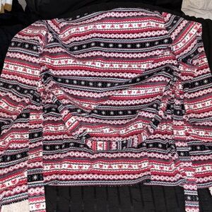 Soft fleece robe with a vibrant pattern. Features a cozy hood. Great used condition.
