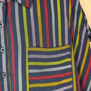 Vibrant stripes in blue, green, red, and yellow. Short sleeves with a classic collar. Button-down front and chest pocket.