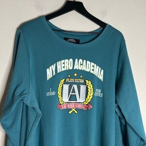 My Hero Academia cozy fleece sweatshirt from Torrid. Teal with front graphic. Scoop neck. Size 3 (3X). See photos for measurements. Good preowned condition with no tears, stains, or picks.