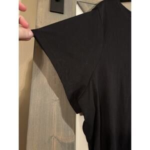 The Torrid NWA T-shirt in size 4X is a stylish women's top in black. This plus-size t-shirt features a solid pattern with a crew neck and short sleeves, making it a basic and comfortable option for everyday wear. Made from a blend of polyester and cotton, this shirt offers a relaxed fit for women who need a larger size.