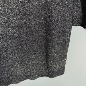 Women's plus size NWT cross neck cold shoulder top by Torrid. This black y2k glam knit top has a silver metallic thread woven in, long sleeves with a cold shoulder, and a zipper closure. It is a rayon, polyester, metallic blend.
