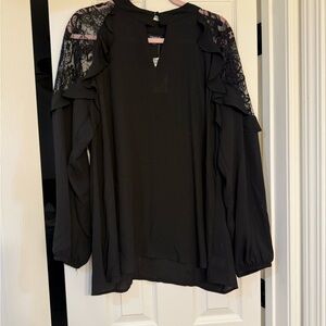 This elegant black top features delicate lace detailing on the shoulders, adding a touch of sophistication to your wardrobe. Perfect for both casual and formal occasions.