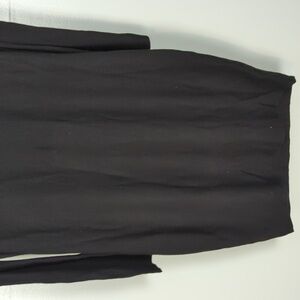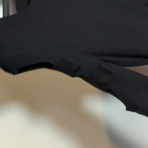 Black. V neck. Long sleeves with cold shoulder and cutouts down to the elbow. Cutouts contine along the upper back. Fitted, bodycon silhouette. New with tags -- no flaws. Laid flat pit-to-pit: 20in. Laid flat waist; 18in. Shoulder to hem: 40in.