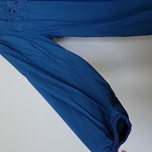 Absolutely gorgeous tone of blouse. I bought this and another just like in another color and they just sat in my closet. They are so gorgeous but I became self conscious with the cut outs on the shoulders. There is elastic at the wrist. Ties that can be worn tied or untied. Same embroidery and cut outs in the back, there's no beading in the back. Lightweight fabric, doesn't stretch. Workplace, office, professional, classy, date night, dinner, elevated, boho, curvy, plus, classic, feminine, fall, autumn, vibrant, embellished, girly