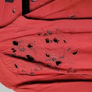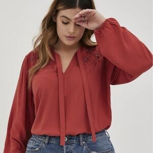 Gorgeous rust colored blouse. Strings tie at the neck or can be worn untied. I bought this and the same blouse in another color and they just sat in my closet. This blouse is absolutely gorgeous. Lightweight fabric, doesn't stretch. Cut outs in the embroidery and the shoulders and across the back. There is no beading in the back, but there is in the front. Elastic at the wrist. Office, workplace, date night, elevated, brunch, dinner, classy, curvy, plus, dinner, boho, vibrant, colorful, fall, dressy
