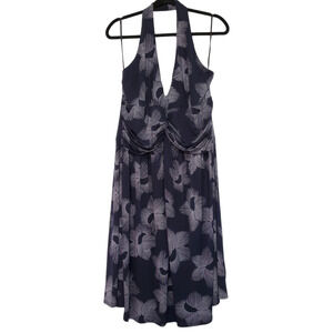 Torrid Navy Blue White Print Halter Dress Stretchy Fit Flare size 18. Deep v-neck, ruching knot detail on front. Made in the USA. Polyester/ spandex. Machine washable. New with tags.
