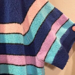 Stylish navy sweater featuring pastel stripes. Short sleeves and soft texture. Ideal for everyday comfort.