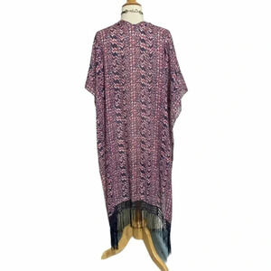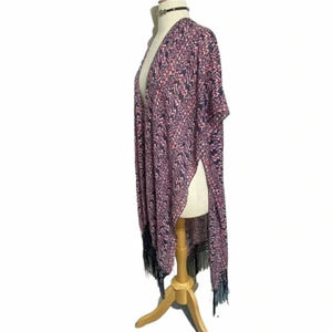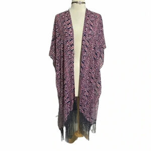 Torrid OS blue/pink Boho print fringe hem kimono