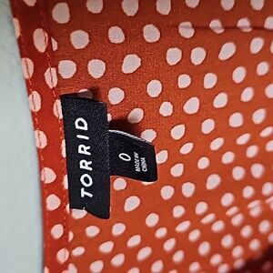 Runs a bit big for a size 0. Could fit up to a XXL in my opinion. Orange with light pink polka dots. Faux button front. Long sleeves. Lightweight fabric, doesn't stretch. Great condition. Shirttail hem. Feminine, workplace, business, brunch professional, girly, brunch, interview, whimsical, fall, autumn, classy, curvy, plus, sweet