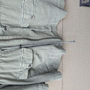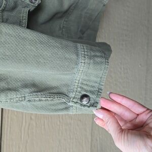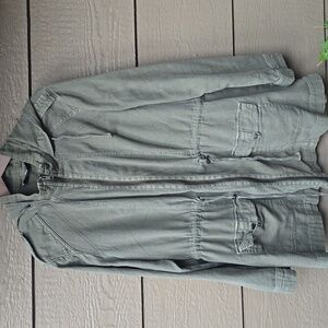 Torrid brand, lightweight jacket in Olive Green. Zip up front. Hooded. Adjustable roll up sleeves. Two front pockets with buttons.