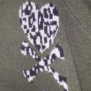 Stay cozy and stylish with this Torrid olive green sweater featuring a bold skull (hearts) and crossbones design. It does have a spot on it below the crossbones (see pics). Perfect for adding an edgy touch to your wardrobe. It's in a ladie's size 2X. Witchy, dark academia, comfy, warm, cozy, top.