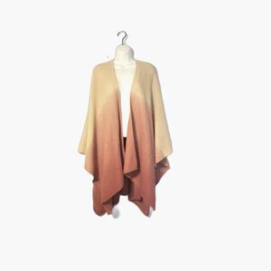 In excellent condition! It has an open front, wide kimono sleeves, a waterfall asymmetrical hemline, and soft knit material. It is a tan and pink Ombré color. One size fits most. Excellent LN pre-loved condition. No signs of garment distress.