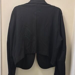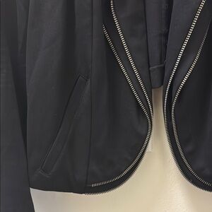 Cute black open jacket with zipper detailing on lapel edges and buttons on shoulders. Cropped in the back. Jacket has functional pockets but they’re lightly stitched closed.