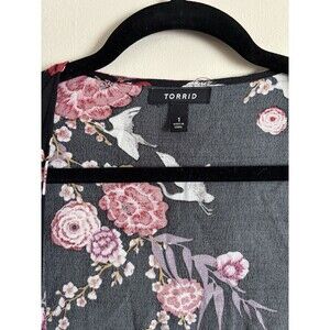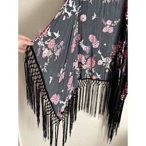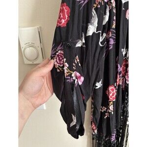 Torrid Open Front Kimono Womens XL Asia Inspired Floral Crane FRINGE Black Red