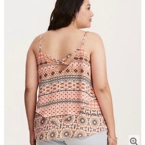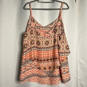 Torrid Orange Boho Sleeveless Cross Back Top. Sleeveless, flowy tank top with a boho-inspired, multicolored pattern. Mix of geometric and floral designs in shades of peach, coral, light blue, and black. The front has a layered ruffle detail, and the back has thin crisscrossing straps. Relaxed fit, making it comfortable and ideal for casual, warm-weather wear. Size 2X.