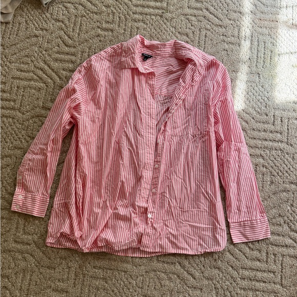 Lightweight oversized button down with coral stripes. Ideal for layering.
