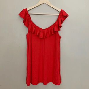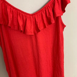 Size 0 Carnival orange Suuuuuper soft fabric Ruffle trim Vneck, vback Rayon, spandex Wash cold, dry low