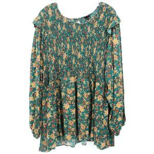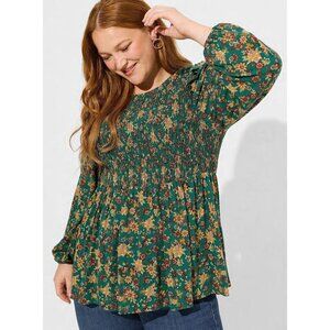 Torrid PLUS (4) 4X Green Floral Boho Peasant Peplum Crinkle Gauze Smocked Top