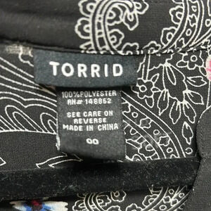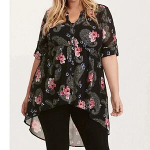 Torrid Women's Blouse. Plus size 00. Black. Floral and paisley print. Button front. Sheer. Split neck. v neckline. Hi-lo hem. 3/4 tab sleeves