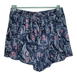Great condition Torrid shorts. Loose fitting, pleat front shorts in a navy blue, pink, and white paisley print. Flat front waist with elastic in back.