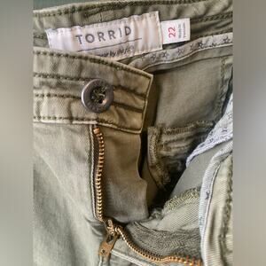 Torrid pants. Fair condition with no stains or rips. Fabric shows wear such as fading. This twill pant has slight stretch with military details like button-flap pockets and utility stitches.