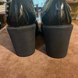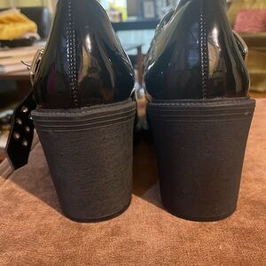 Stylish black patent heels with chunky design. Features eye-catching grommet strap. Perfect for adding flair to any outfit. Size 9WW. No flaws and look as if the were never worn.