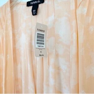 NWT Torrid Peach Border Print Gauze Kimono Size 0X. The sherbet gauze on this kimono is primed for a catching a breeze, with a subtle white tie dye pattern splotched all over. A multi-color, "picked this up on vacation" inspired border print lines the slightly bell sleeves and draped front.