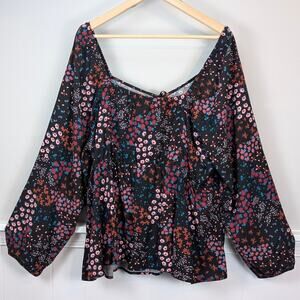 Torrid Peplum Challis Sweetheart Top, Black Floral Long Sleeve Peasant Blouse 3x