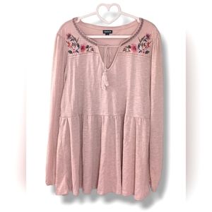 Chic pink top with floral embroidery. Long sleeves. V-neckline. Perfect for casual wear.