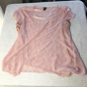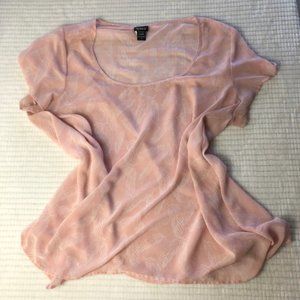 Birds of a feather flock together; if you're rocking this blouse, can we be a part of your squad? Semi-sheer pink chiffon with a sharkbite hem to boot (get ready to groove) the ultra-feminine top has a white feather print dotting the design.Good, used condition. No stains or holes.