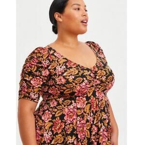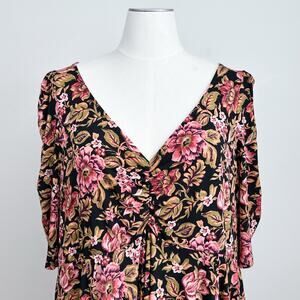 Size 5 Torrid dress. Stretchy fabric with a pink and green floral print on black background. V-neckline with ruching along the center seam. Longer length short sleeves with ruching. About knee length, depending on your height. Pockets! No flaws, great condition!