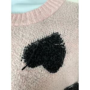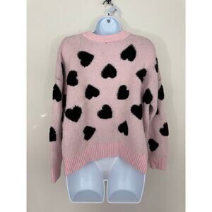 Cozy and cute Torrid pink fuzzy knit sweater with bold black hearts throughout. Ribbed neckline and hem for a comfy, relaxed fit.