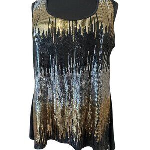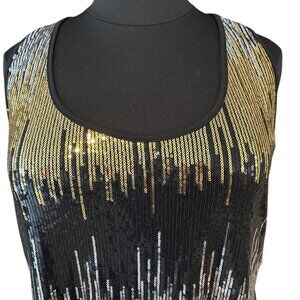 Torrid (pink label vintage!) summer fun ready, black tank top adorned with gold, silver and black sequins. The sequins are arranged vertically, creating a gradient effect from gold at the top and bottom to silver in the middle. The tank top has wide straps and a scoop neckline. Size 3.