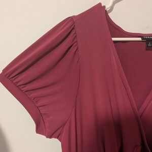 Torrid Boysenberry Pink Puff Sleeve Studio Knit Surplice Tie Waist Mini Dress Size 2 (2X or 18/20 in other brands) in Torrid's boysenberry color. This is a pretty dress featuring a v-shaped surplice or wrap style neckline, mini length, puff short sleeves, a waist tie, two pockets, and stretchy fabric. Great to wear in the spring, summer, or anytime with warm weather. This would be a really cute dress for work/the office, an outdoor event such as a picnic or barbecue, a party, a date, Easter, or Valentine's Day. The pink color and silhouette give some Barbie vibes and make this a really fun feminine style.