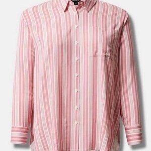 Wear it buttoned down as a business casual blouse or roll it up and tie at the waist for a perfect breezy brunch top. White buttons, pink and white striping, foldable cuffs and collar, delicate soft and quality material. Size Torrid 00 which is equivalent to a size 10. Gently used, smoke free, dog friendly home.