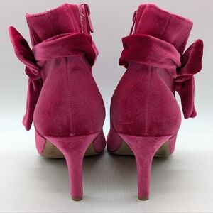 Torrid Pink Velvet Bow Accent Side Zip Heel Ankle Boot 9WW. Stain on one toe, haven't tried removing (see photos). Size 9 wide width.