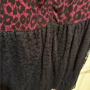 Chic pink and black blouse/shirt. Features a stylish neckline. Sassy leopard print is perfect for hitting a concert or getting drinks with girlfriends. Hides belly pretty well if that's something you're self conscious about. Very soft and comfortable material. There is material under the lace overlay to prevent it from being itchy.