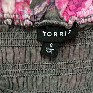 Chic floral blouse with vibrant pink and gray hues. Off-shoulder design. Perfect for stylish outings.