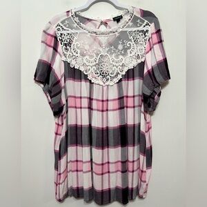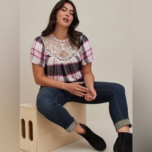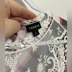 Torrid Plaid Crochet Lace Crinkle Gauze Blouse