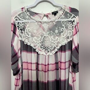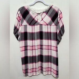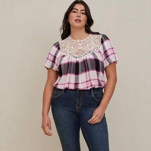 Torrid Plaid Crochet Lace Crinkle Gauze Blouse