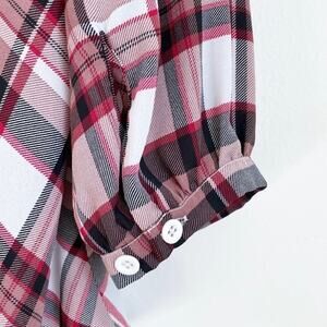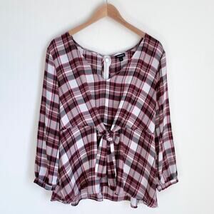 1X Torrid v-neck blouse. Lightweight georgette fabric in a classic plaid print. Peplum flounce with a tie-front detail. Button cuffs on sleeves. Zipper in back. Great condition!
