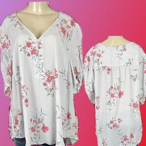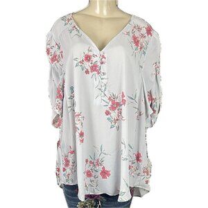ITEM: Torrid Plus 3 Light Gray Floral V-Button Neckline Ruched Half Sleeve Blouse