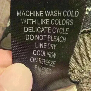 Dark olive green wide leg pants that taper at the leg and have side ruching on both sides of each leg cuff. Back elastic, flat front, mid rise. 100% rayon. Excellent used condition.