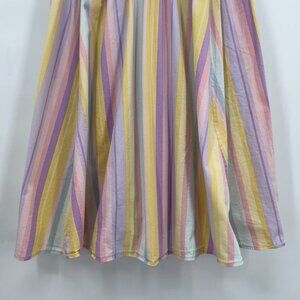 Brighten your wardrobe with this Torrid sundress featuring cheerful pastel rainbow stripes in pink, yellow, purple, mint, and blue. The dress has a flattering tie-front detail, adjustable spaghetti straps, smocked back for added comfort, and hidden side pockets. Made from a lightweight cotton blend with a partial lining, perfect for spring and summer outings, vacations, or casual wear.