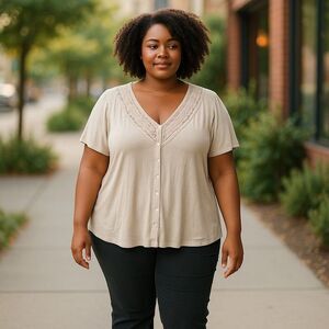Keywords: Torrid blouse, plus size, beige top, lace detailing, button accents, casual wear, short sleeve, women's fashion, all seasons, machine washable.