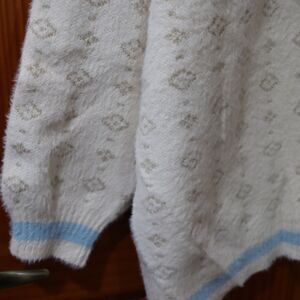 This Torrid pullover sweater features a soft white base adorned with an all-over "Gemmie" geometric motif in light tan. A subtle light blue stripe accents the neckline and waistband. The eyelash lurex knit adds texture and visual interest, creating a cozy yet eye-catching piece. The relaxed fit is perfect for layering over tees or under jackets. Fun, whimsical, and versatile, it’s ideal for casual outfits or standout cozy looks.