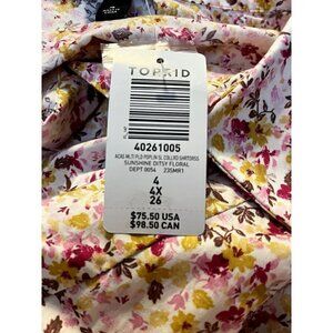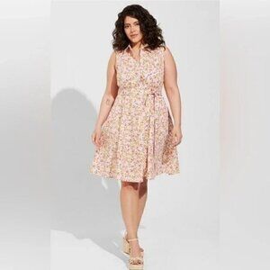 Torrid Plus Size 4, 4X, 26 Poplin Sleeveless Shirtdress Sunshine Ditzy Floral. Dress is White, pink, lavender and tan. 97% cotton, 3% spandex. Machine wash cold. Line dry.