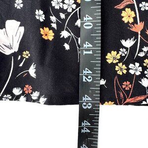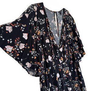 Torrid Faux Wrap Dress. Size: Plus Size 4. Color: BLACK FLORAL with white, yellow and dark orange flowers. Deep v-neck that is sewn shut so it won't come loose. Floaty bell sleeves that come down to your elbows. Elastic waist gives you gentle curves. Faux (sewn shut) wrap skirt that is twirly and flattering